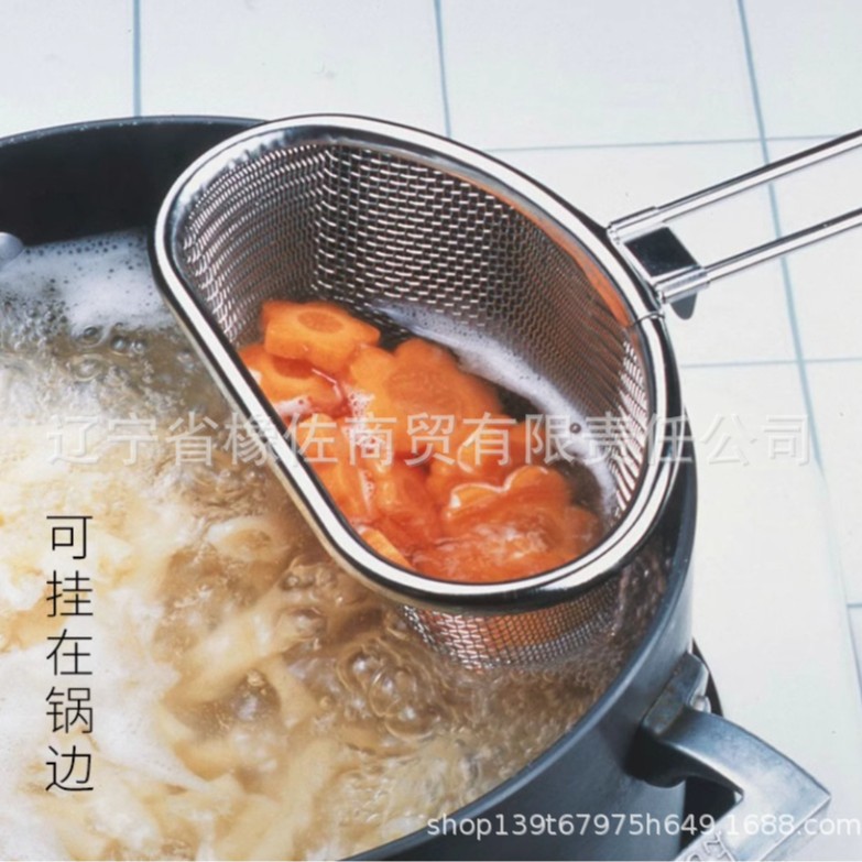 日本輸入ステンレス鍋ザル、豚脳麺、麺類を揚げるためのふるいフック付き麺フィルター