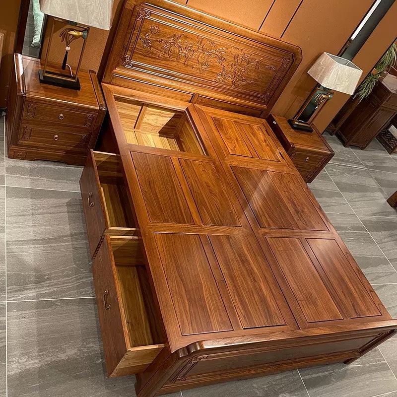 老楡木家庭用寝室ベッド実木畳収納物高箱多機能新中国式主臥二人ベッド