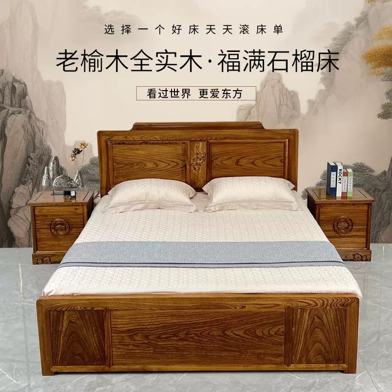 新中国式実木老楡木家庭用寝室実木ベッド貯蔵物高箱多機能ツインベッド中国式家具
