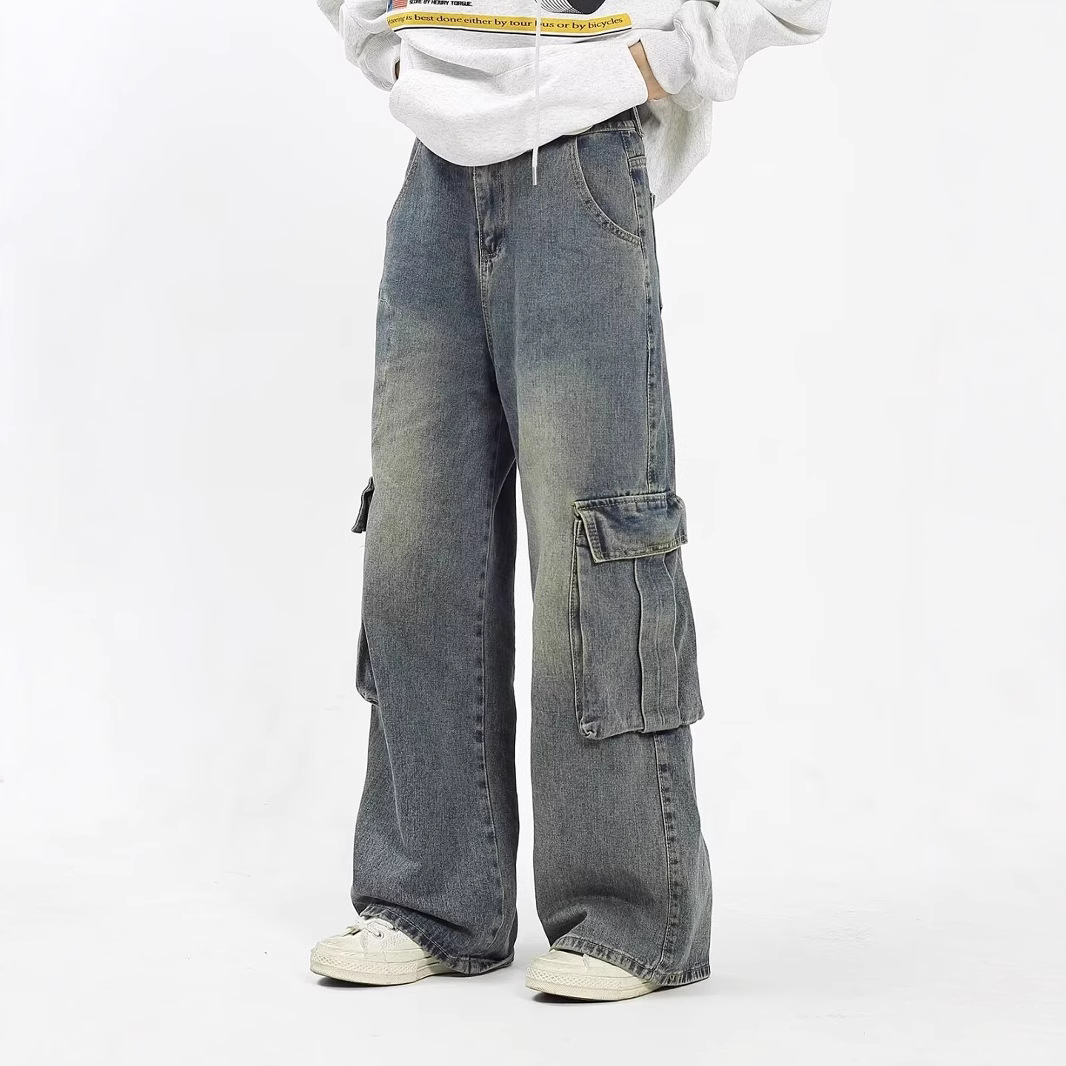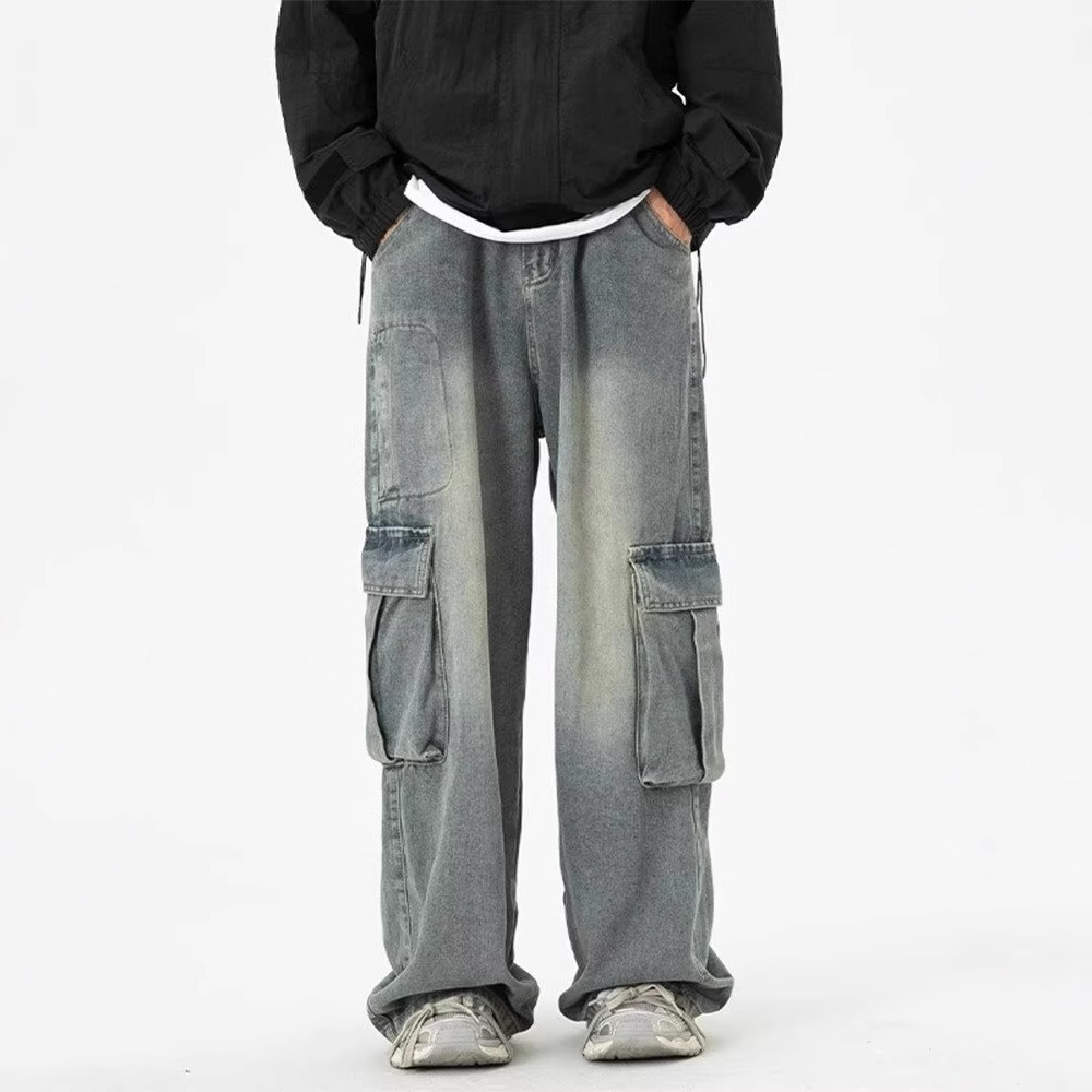 広脚工装ジーンズ男型秋潮牌大ポケットゆるいズボン水洗い復古高街モップズボン