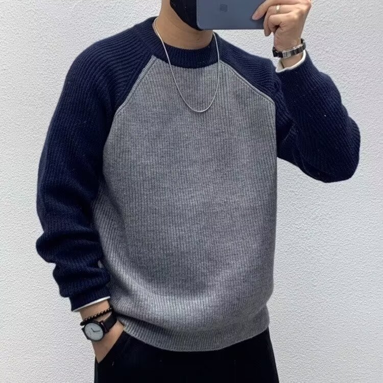 色合わせの肩袖のセーターの男性の2024秋冬の新型のカジュアルな丸首は底のニットの上着のファッションの札を打ちます。