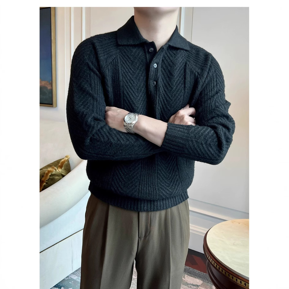 秋冬のカジュアルな長袖の襟のセーターの男性の英倫の復古のジャカードの軽い熟のPOLOは身を修めて底のニットの男を打ちます。