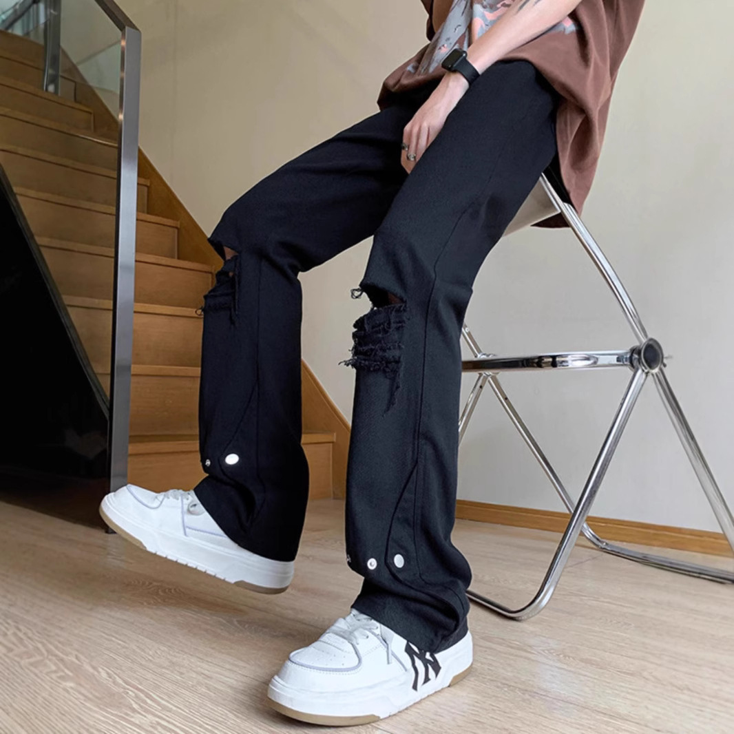 ハイストリートハンサムスリムリベットリップドジーンズメンズ夏アメリカンファッションブランドルーズスリムストレートカジュアルパンツ