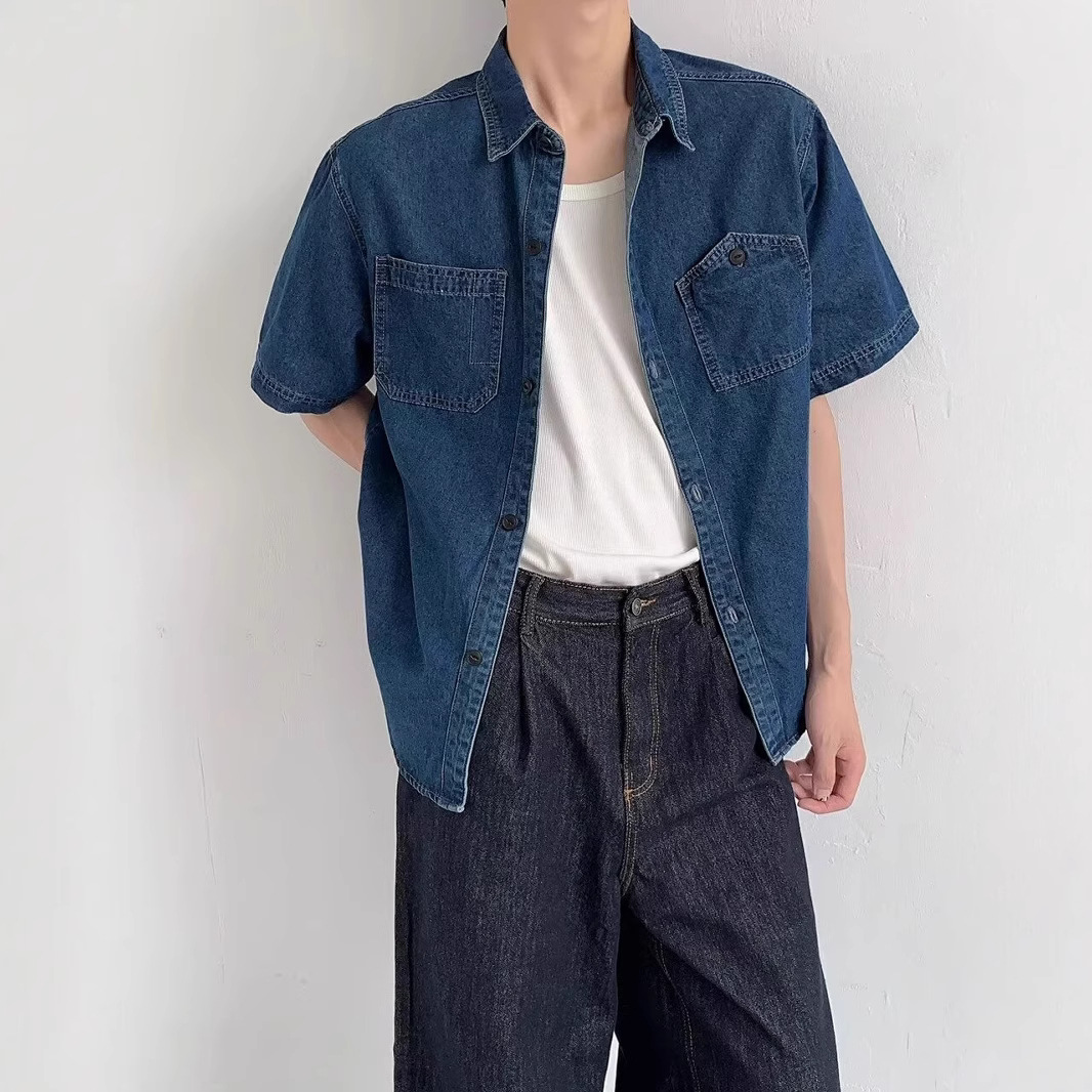 ブルーデニムシャツメンズ春夏クリーンフィットアメリカンレトロデザインハイエンドシャツジャケットトップ