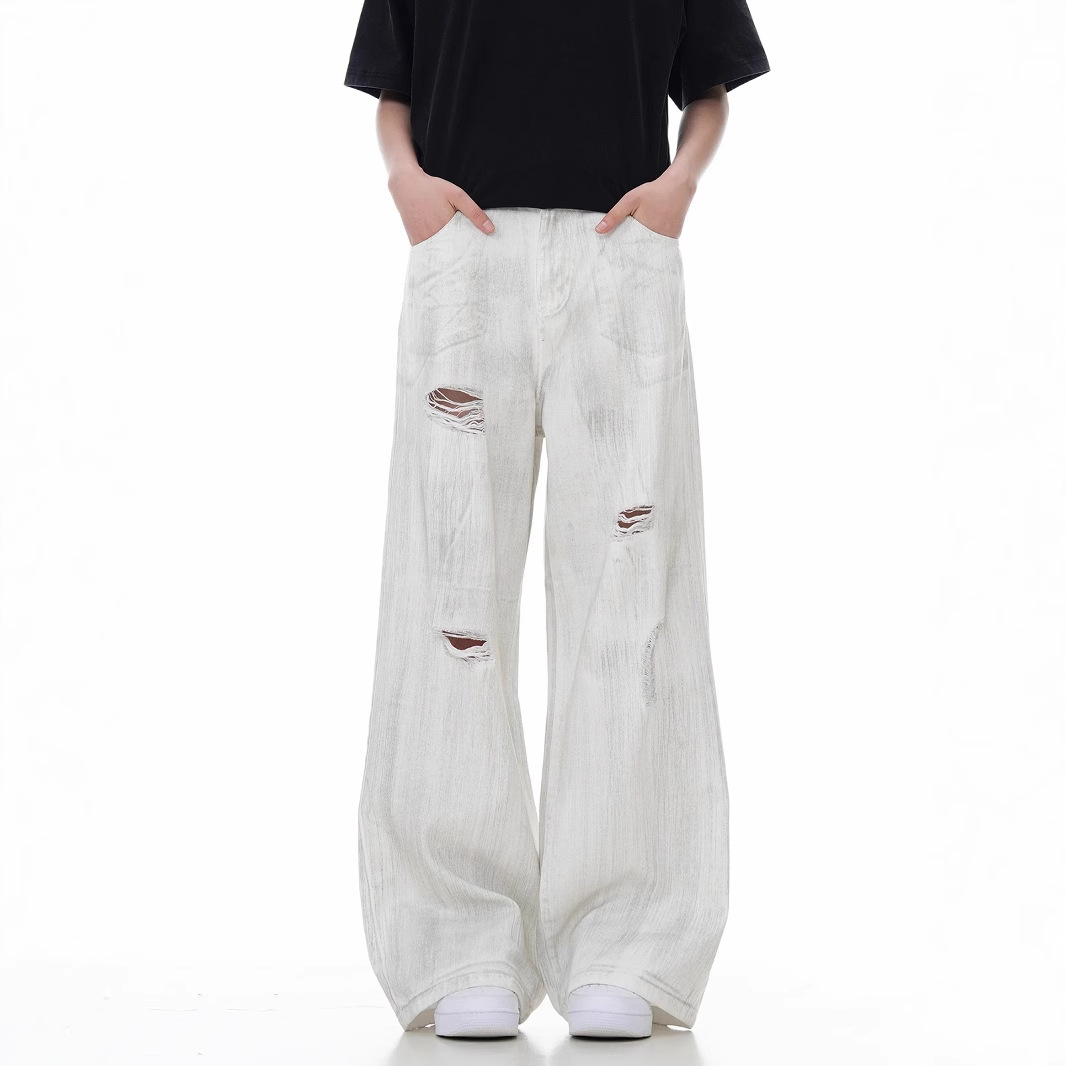 2025 新しいレトロトレンディなアメリカンスタイルのダメージ加工ウォッシュジーンズメンズストリートルーズトレンディな多用途ワイドレッグパンツ