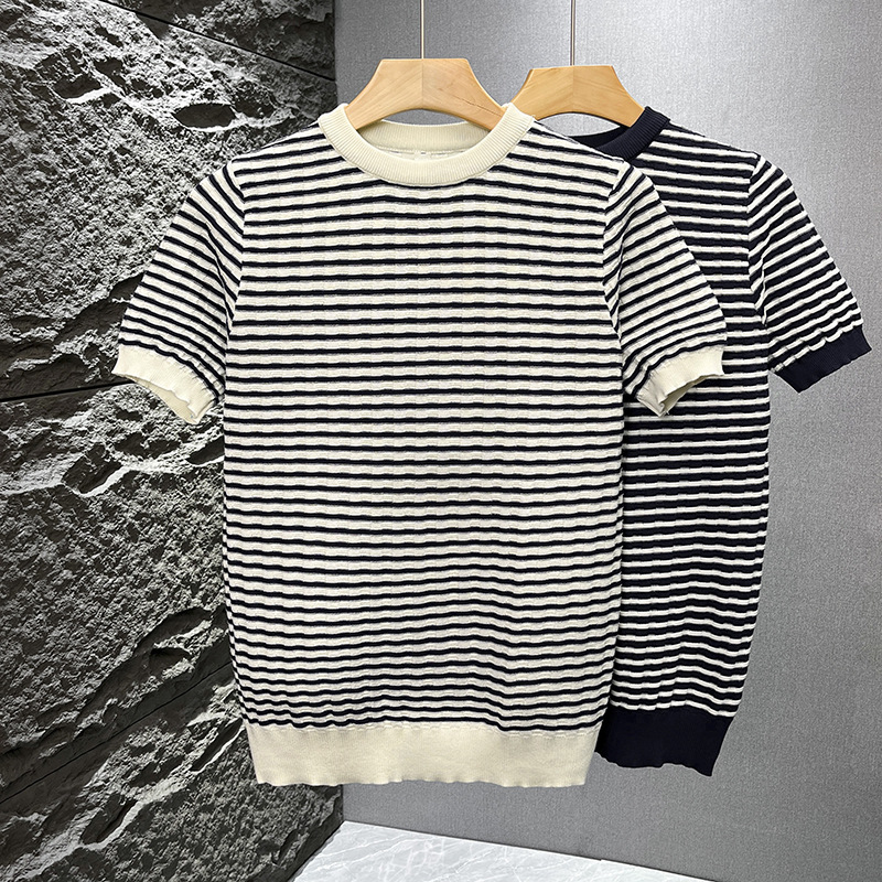 ストライプコントラストカラーラウンドネック半袖Tシャツメンズトレンディなアイスシルクニット半袖Tシャツ夏ルーズカップルトップ