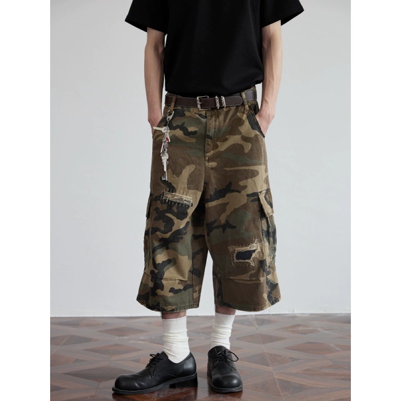アメリカンレトロ迷彩カーゴショーツメンズミッドパンツ2025新しい夏のトレンディなカジュアルストレートレッグクロップドパンツ男性用