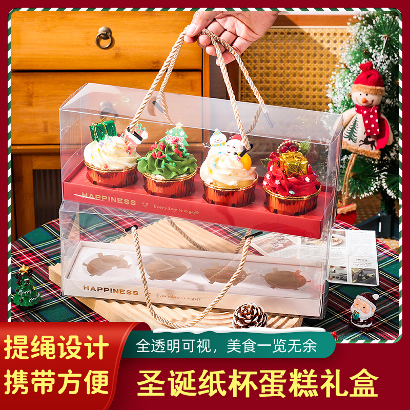 クリスマスのクリスマスイブの紙コップのケーキは透明なギフトボックスを持っています。