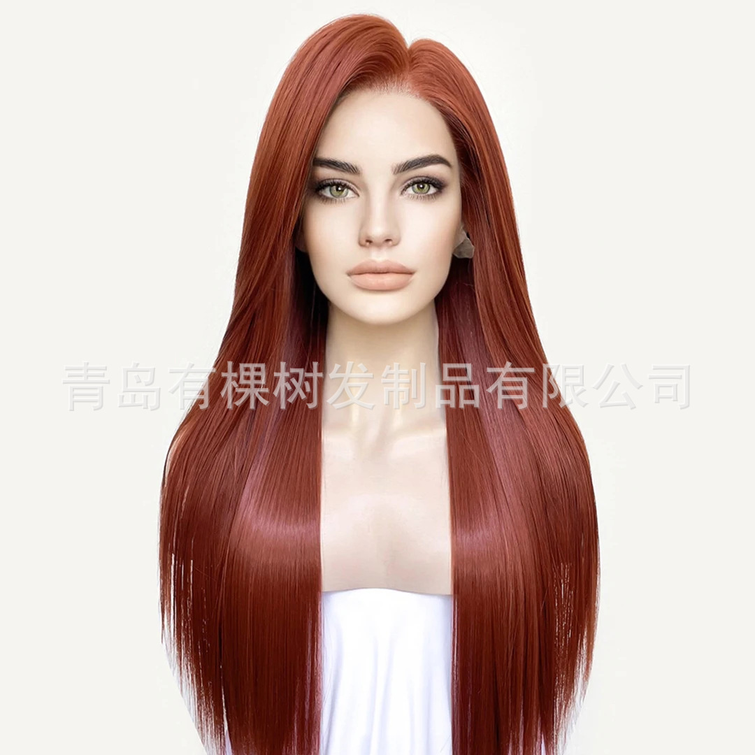 欧米のかつらの輸入の糸のつや消しの高温の糸の化学繊維の前のレースの頭カバーの赤い茶色の長いまっすぐな髪は代行します。