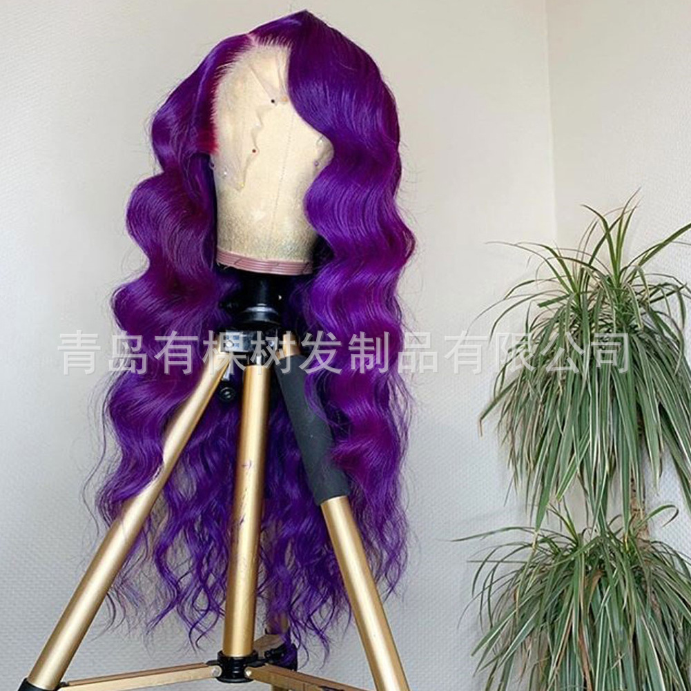アマゾンの新商品欧米のかつらの女性の前のレースの紫色のbodyの長い巻き髪の化学繊維のかつらのカバーのメーカーは卸売りします。