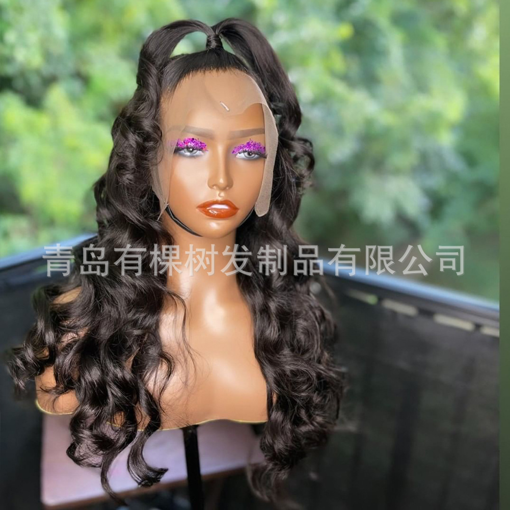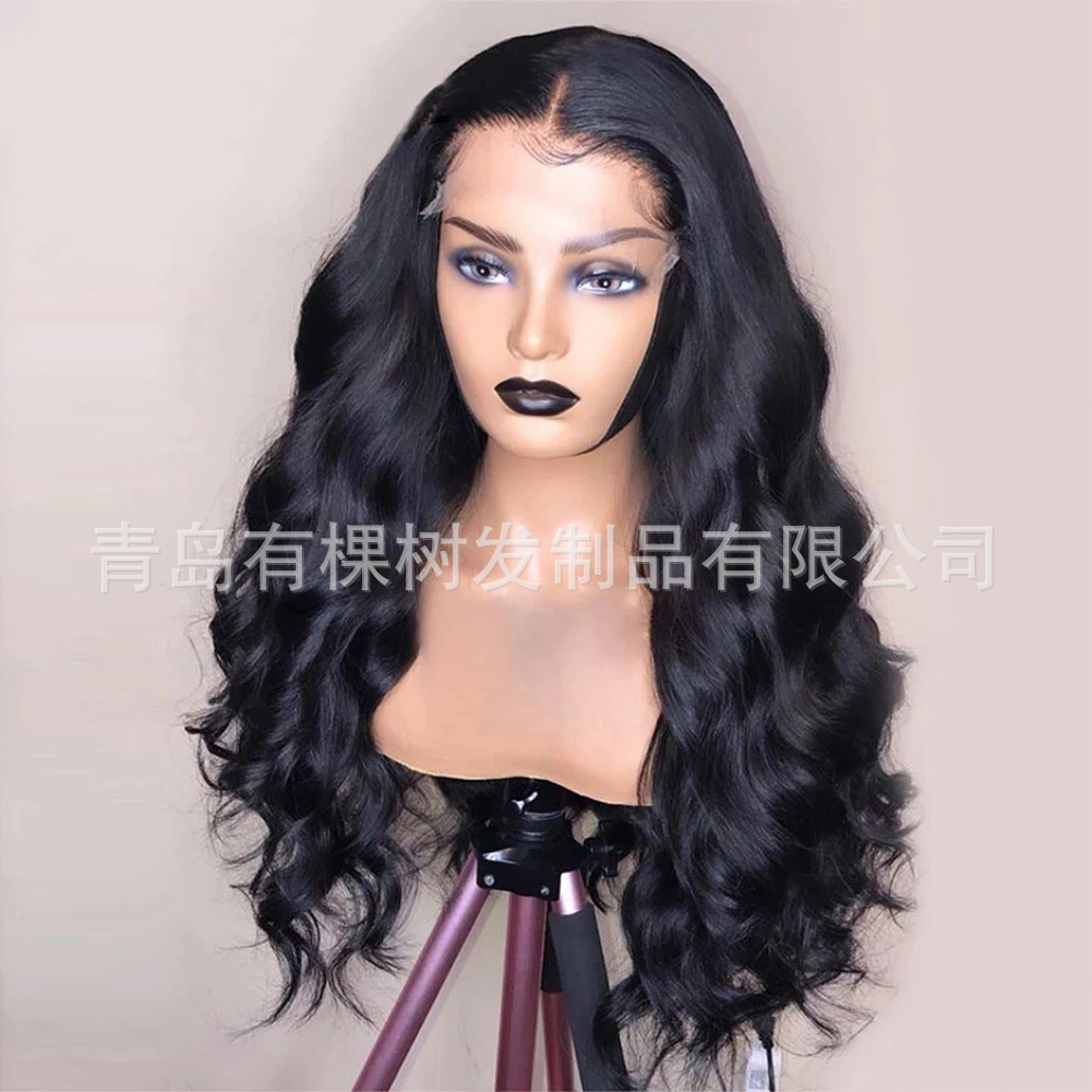 フロントレースかつら欧米のかつらレディースロング巻き髪wigブラックビッグ波高温糸かつらカバー