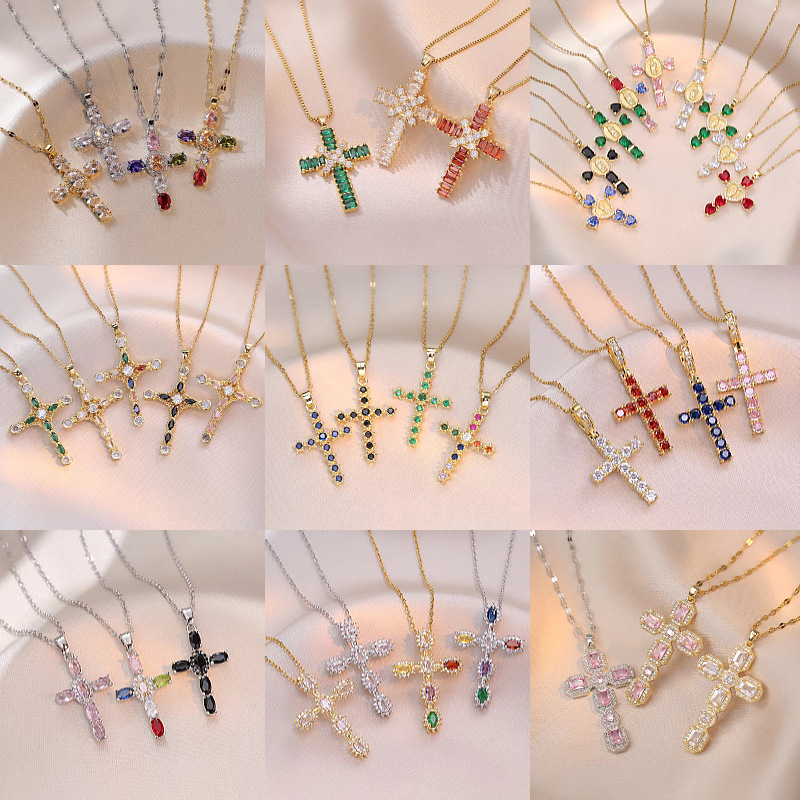 ネックレス女性欧米クロスボーダー創意個性聖母クロスネックレス気質透かし彫りカラージルコン鎖