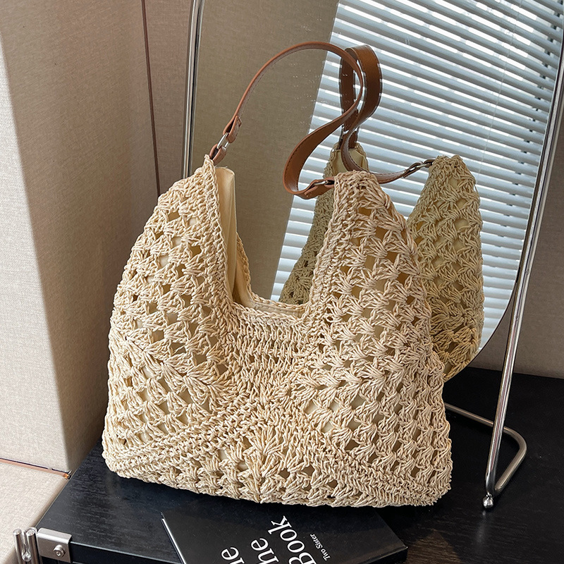 編み物バッグ女性夏2024新型大容量草編みバッグ海辺のリゾートビーチシングル肩通勤バッグ