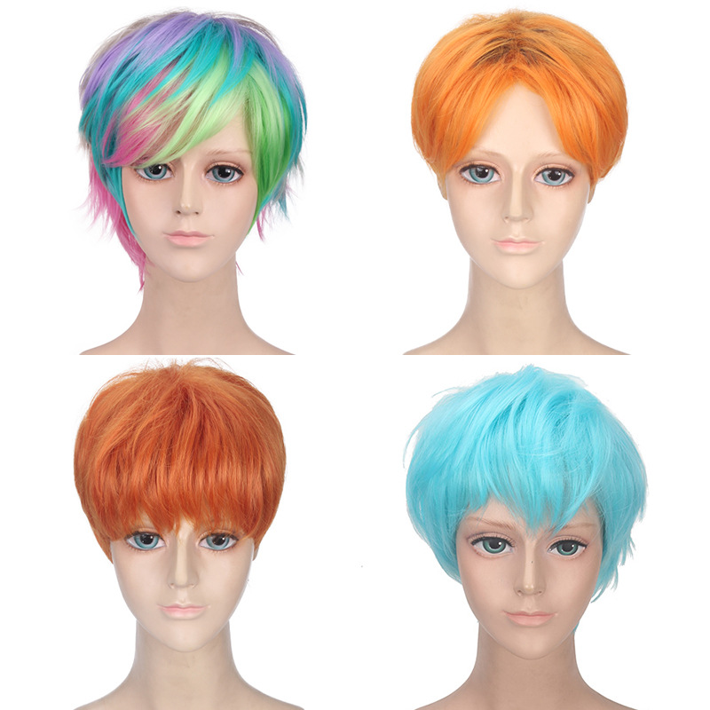 主聖達ネットの赤いかつらの男性の中で前髪の短い髪の七色のグラデーションの自然なふわふわしている学生の短いカールを分けます。