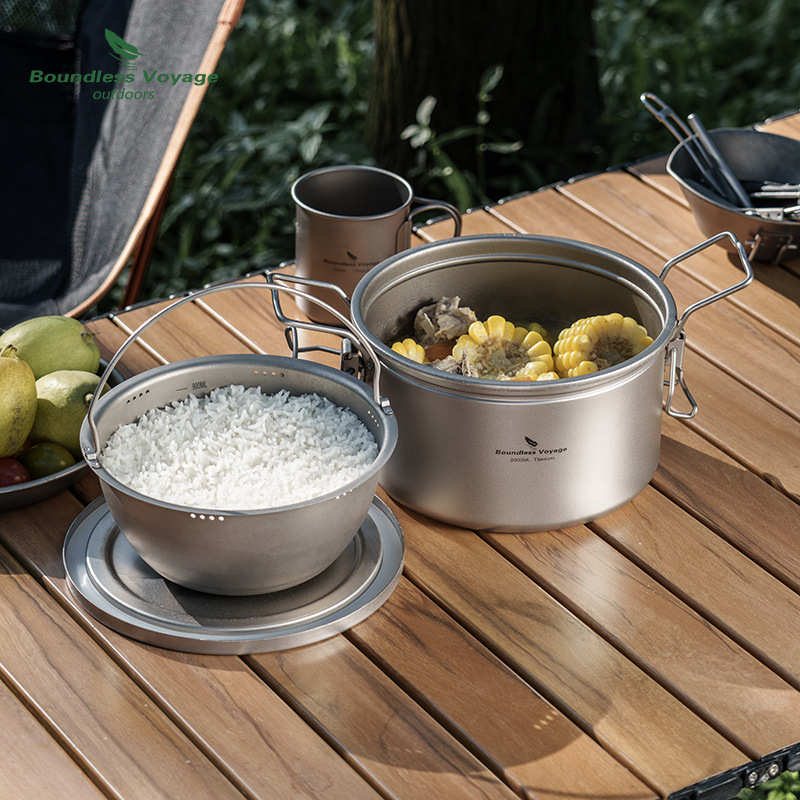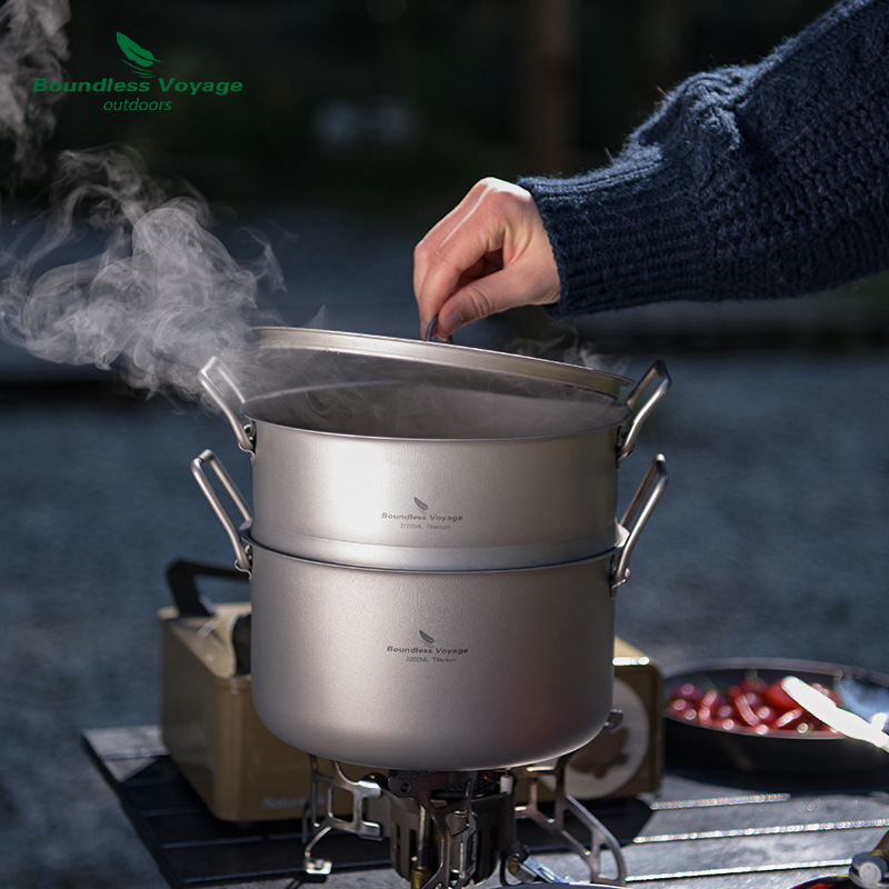 【在庫一掃セール・価格交渉不可】Biwei アウトドア 純チタン キャンプ用スープポット・蒸し器セット 2.2L 軽量 ポータブル