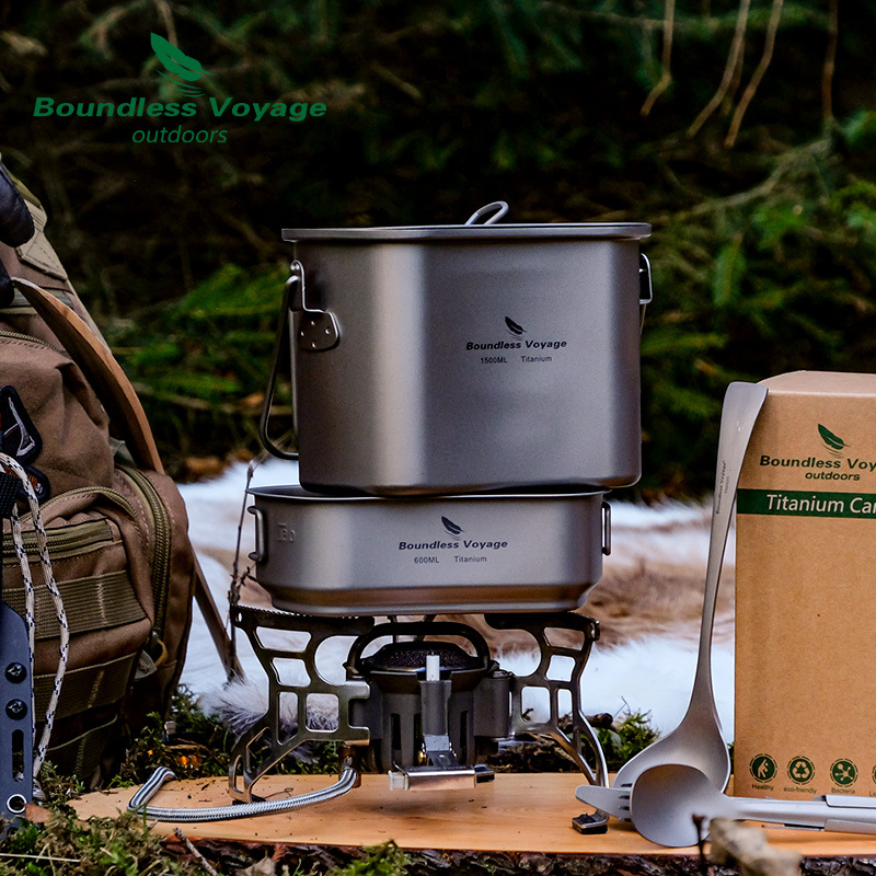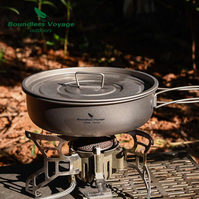 必唯純チタンチタン鍋セット鍋軽量折り畳みハンドル屋外調理器具2合1鍋セットキャンプ蒸鍋弁当箱フライパン