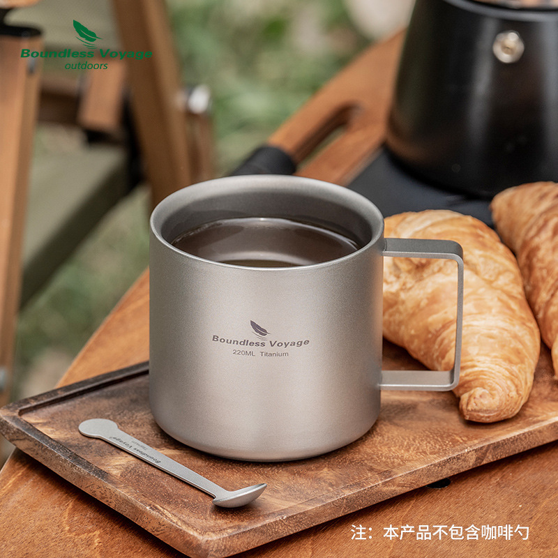 Biwei 純チタンコーヒーカップ固定ハンドル付き超軽量ポータブルチタンウォーターカップティーカップ二重層火傷防止 220 ミリリットル