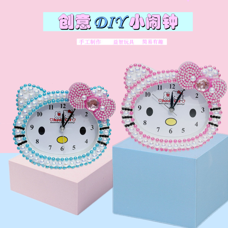 子供diy小さな目覚まし時計手作りペーストダイヤモンド学生時計かわいいkt猫クリエイティブおもちゃ卸売