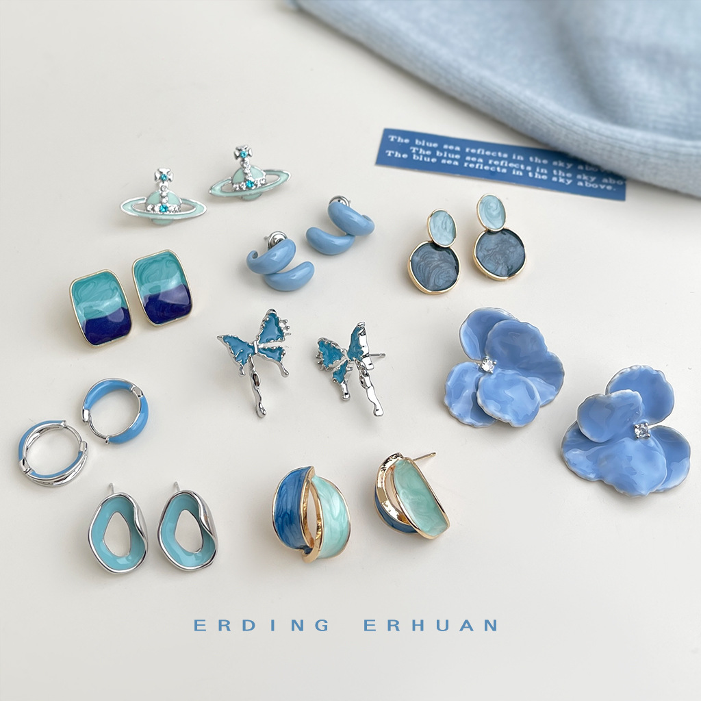 スモッグブルー高級感銀針メッキ14k幾何学異形不規則ピアス釉薬耳飾り工場イヤリング女