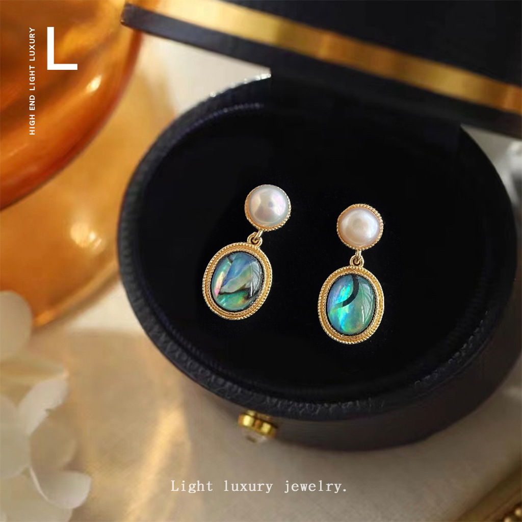 淡水真珠フランスレトロ真貝殻アワビ貝楕円幾何学メッキ14k新型耳飾り工場イヤリング女