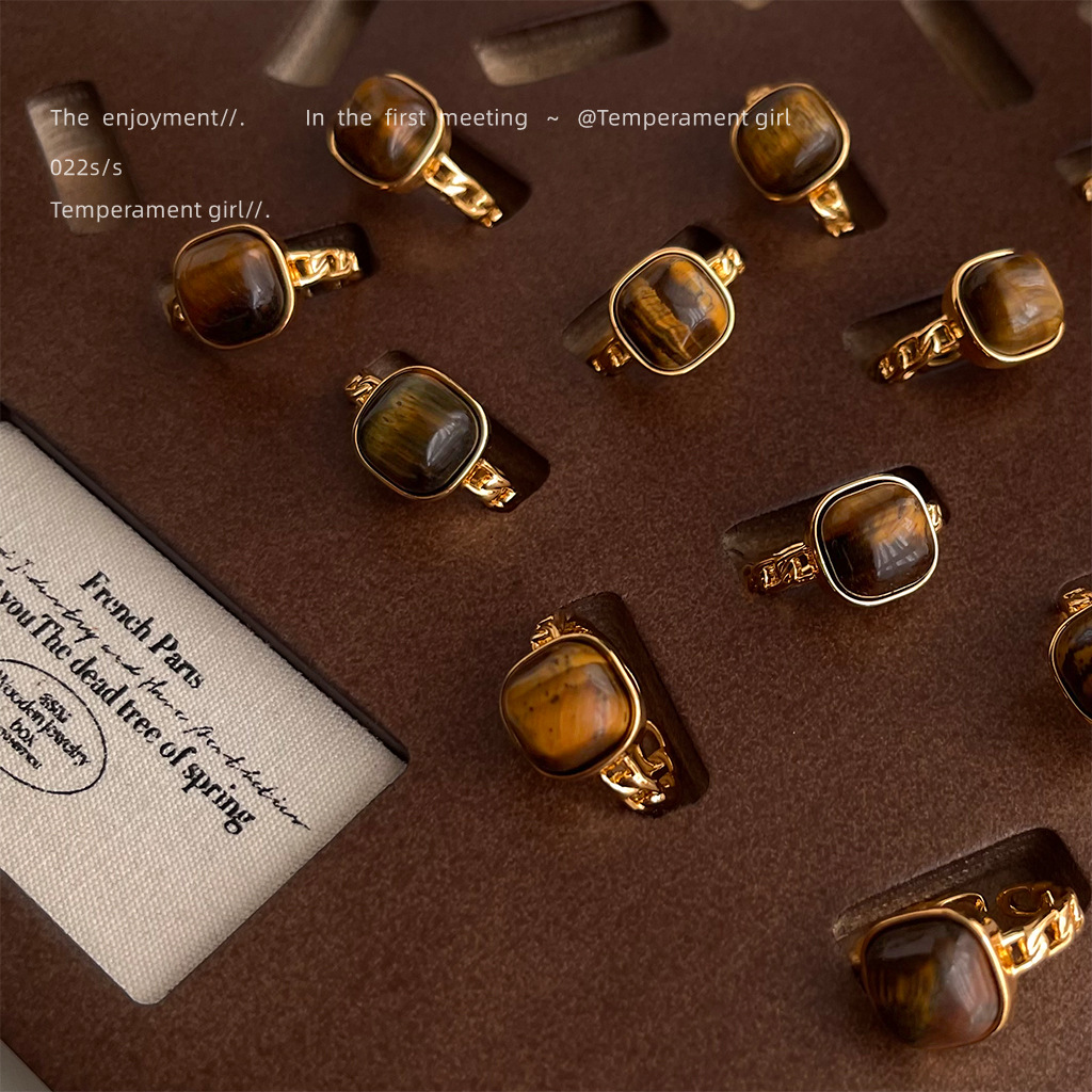 メッキ18k真金フランスレトロ天然石虎眼石方形幾何学肥方指輪開口調節可能な指輪