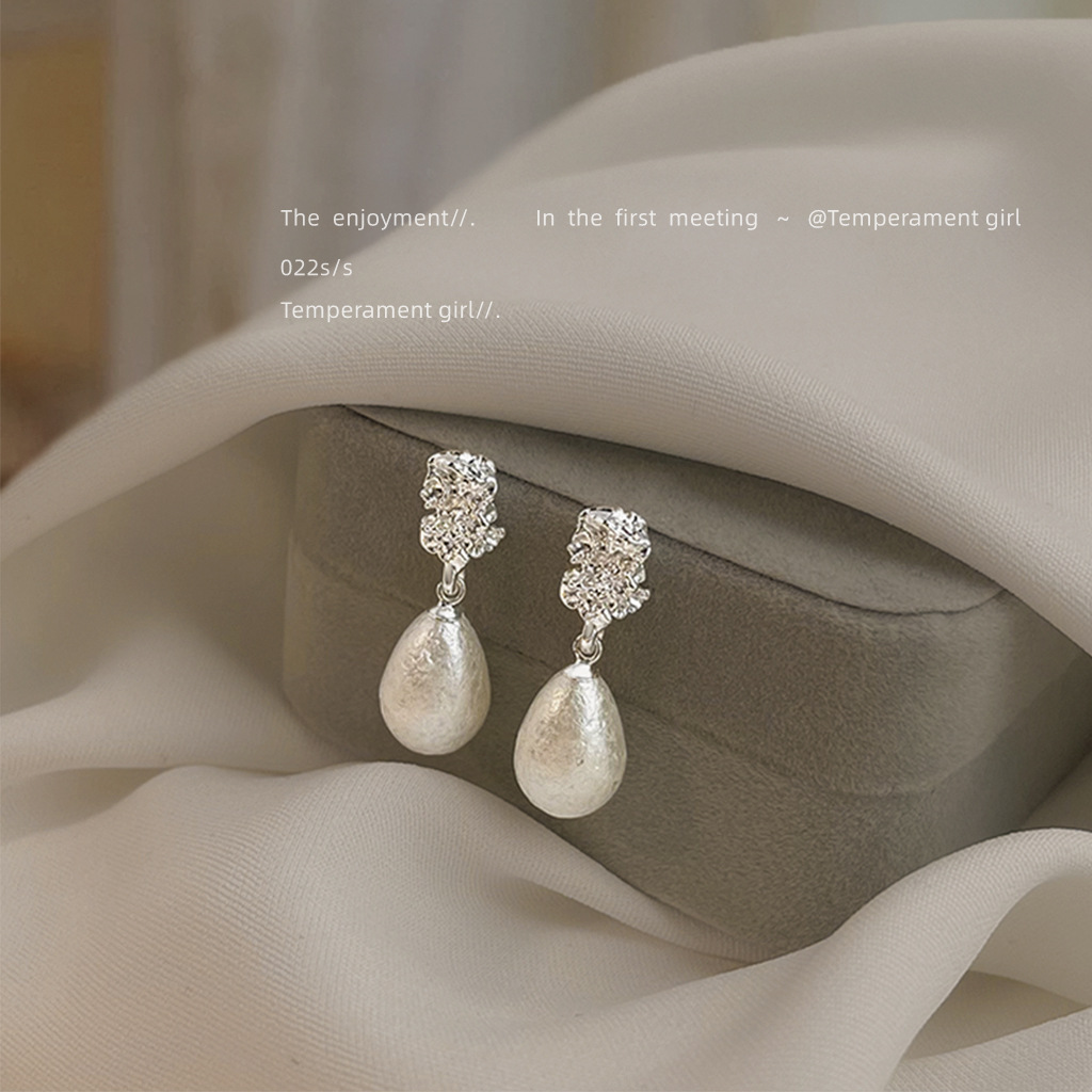 フレンチテクスチャスノーフレークパールドロップ925シルバーニードルイヤリング、エレガントでハイエンドのファクトリーライトラグジュアリースタイルイヤリング女性用