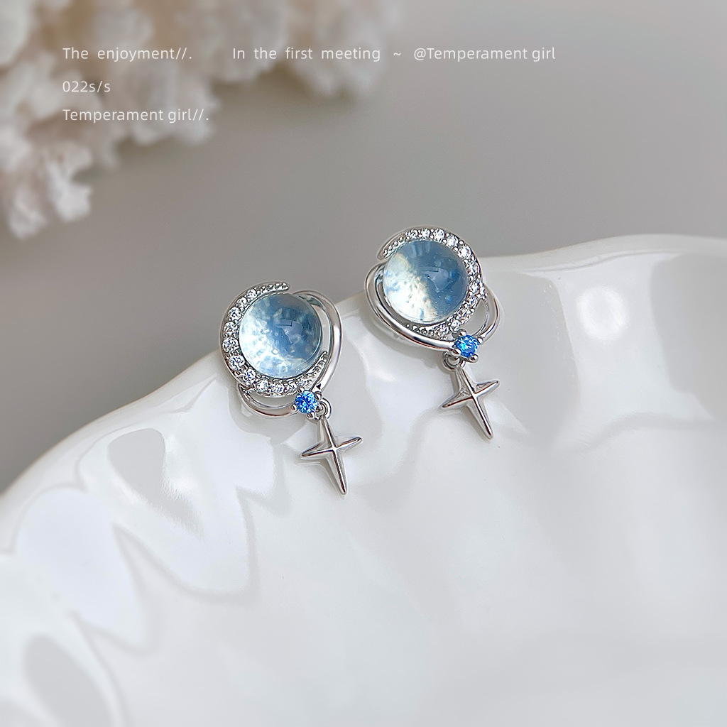 新鮮で甘い新しいマイクロ象嵌ジルコン 925 シルバー針アクアマリンカラー八芒星イヤリング工場イヤリングサプライチェーン