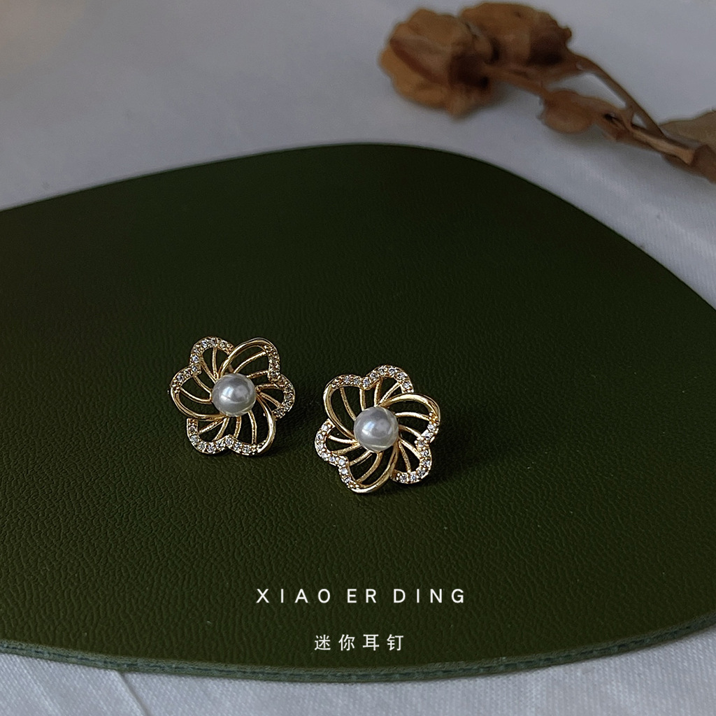 赫本風の高級感の小さいジルコンの透かし彫りの花の気質のピアスのフランス式の優雅なツバキの花の真珠のイヤリングの女性
