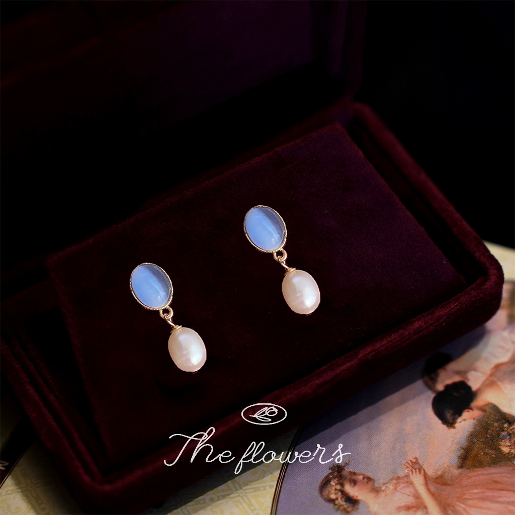 淡水真珠フランス復古ガラス猫眼石手作デザイン小型シンプル通勤メッキ14k耳飾りイヤリング