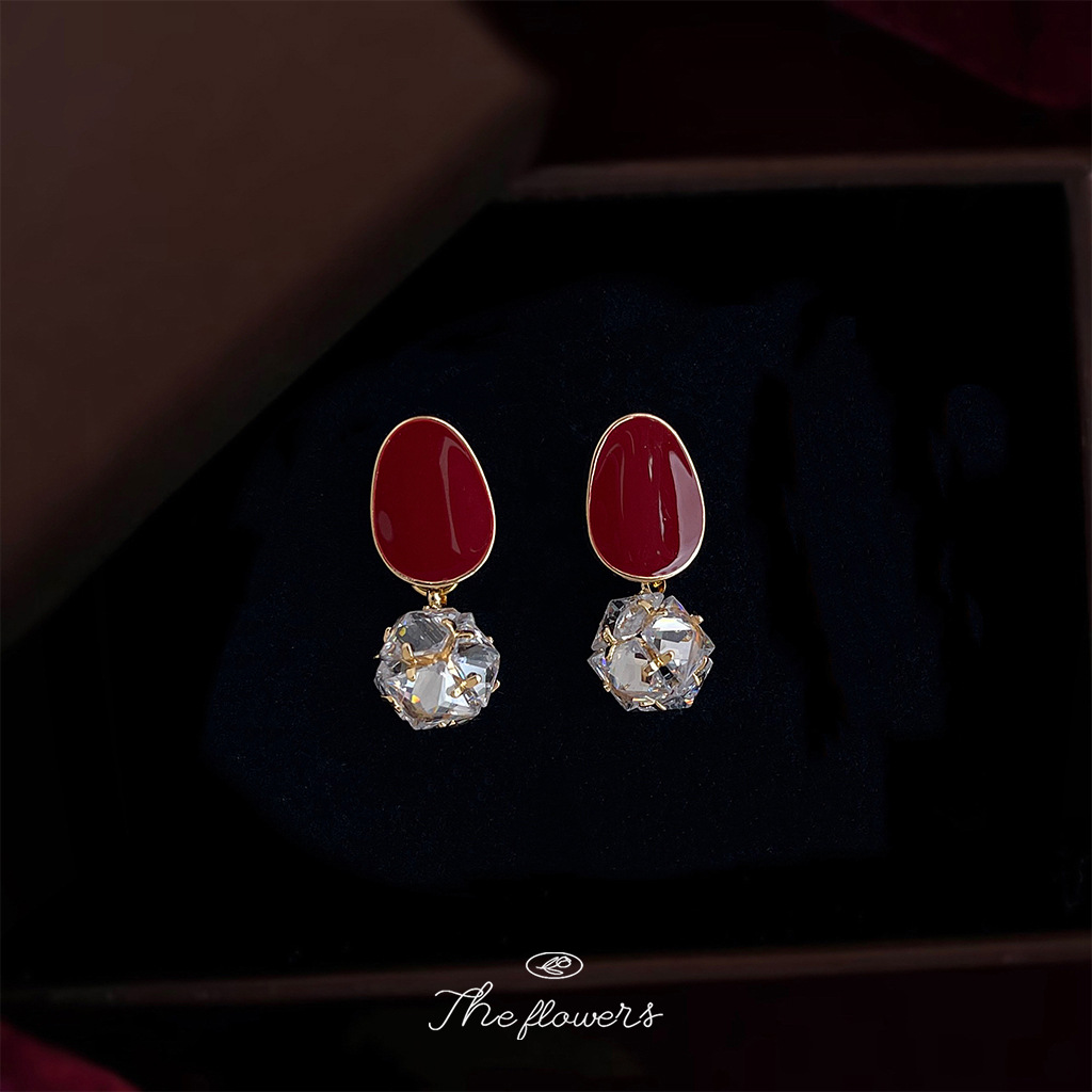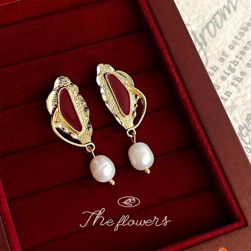 フランスレトロ淡水真珠メッキ14kワインレッド滴油異形不規則耳飾り工場イヤリングアクセサリー女