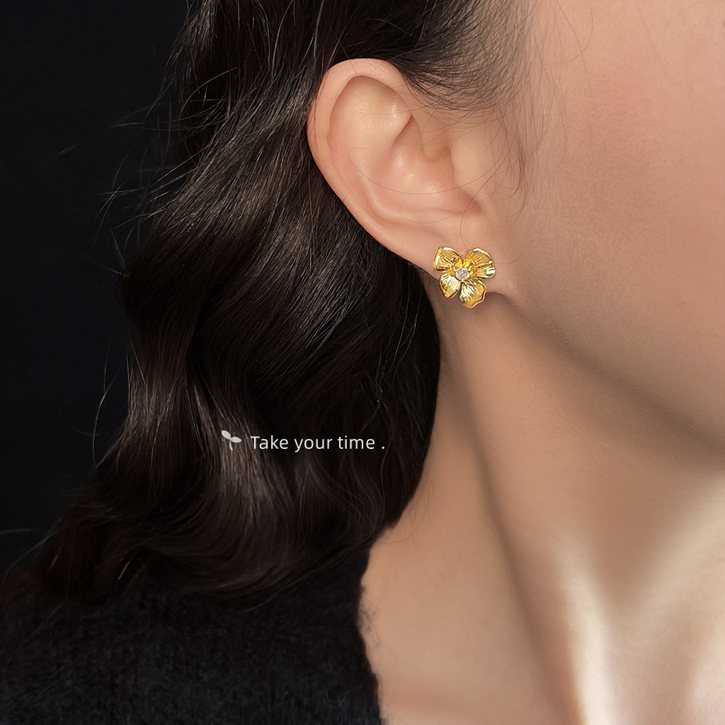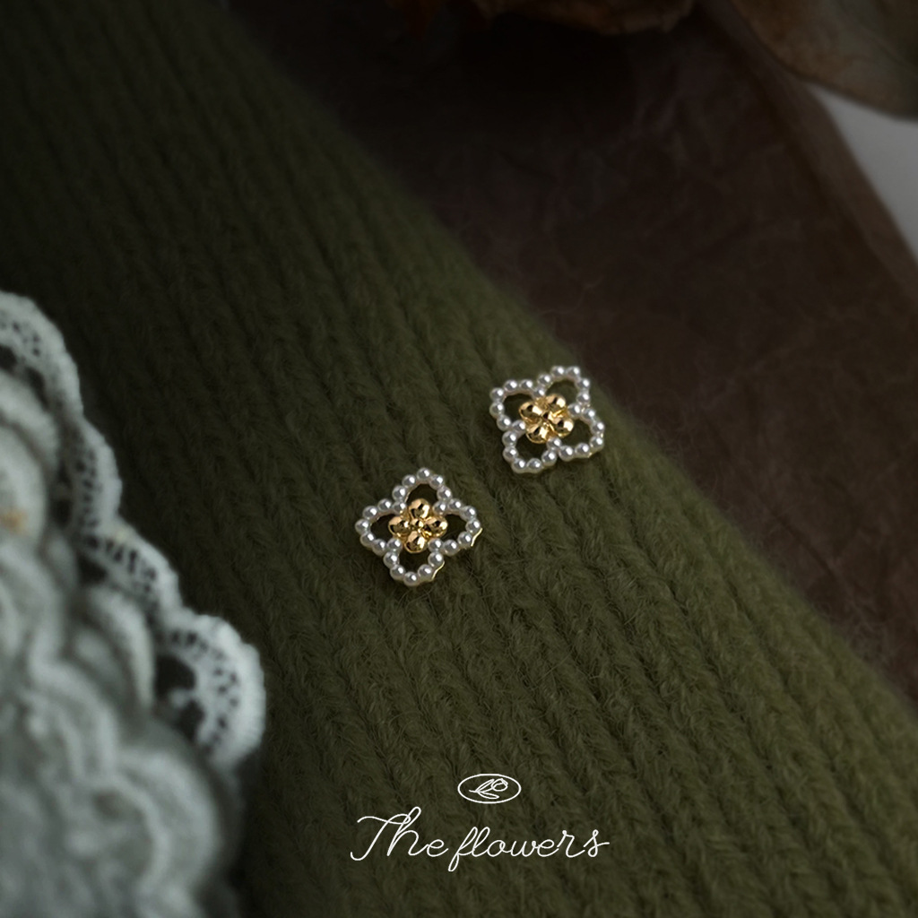 軽豪華風925銀針メッキ14kシンプルで小さな幾何学四葉花ピアス気質通勤百合耳飾り工場