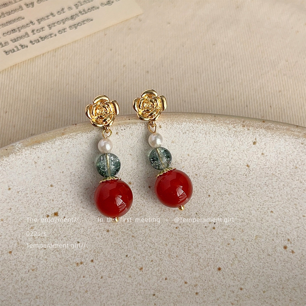 新中国風紅瑪瑙手作りデザイン感文芸レトロバラオリジナル耳飾り2024年新作イヤリング女