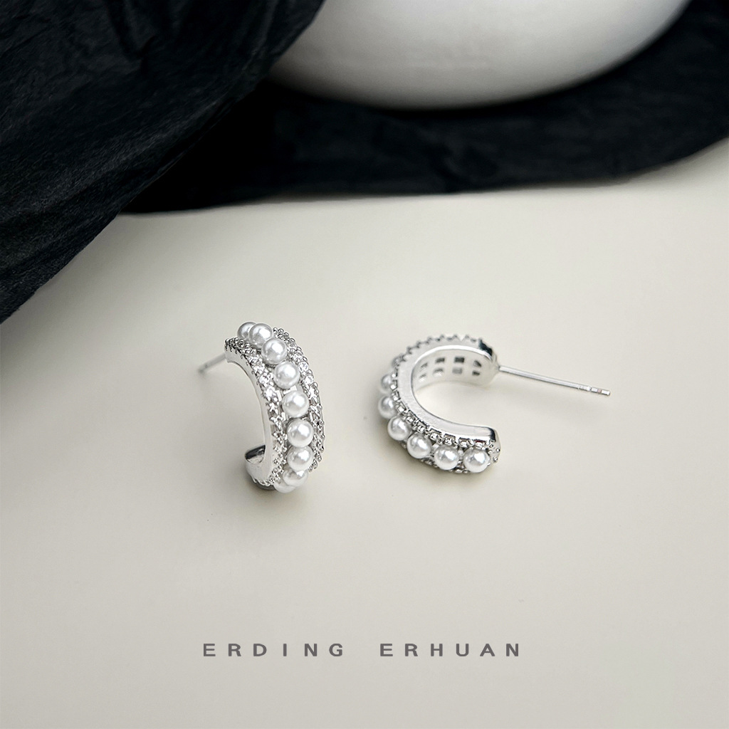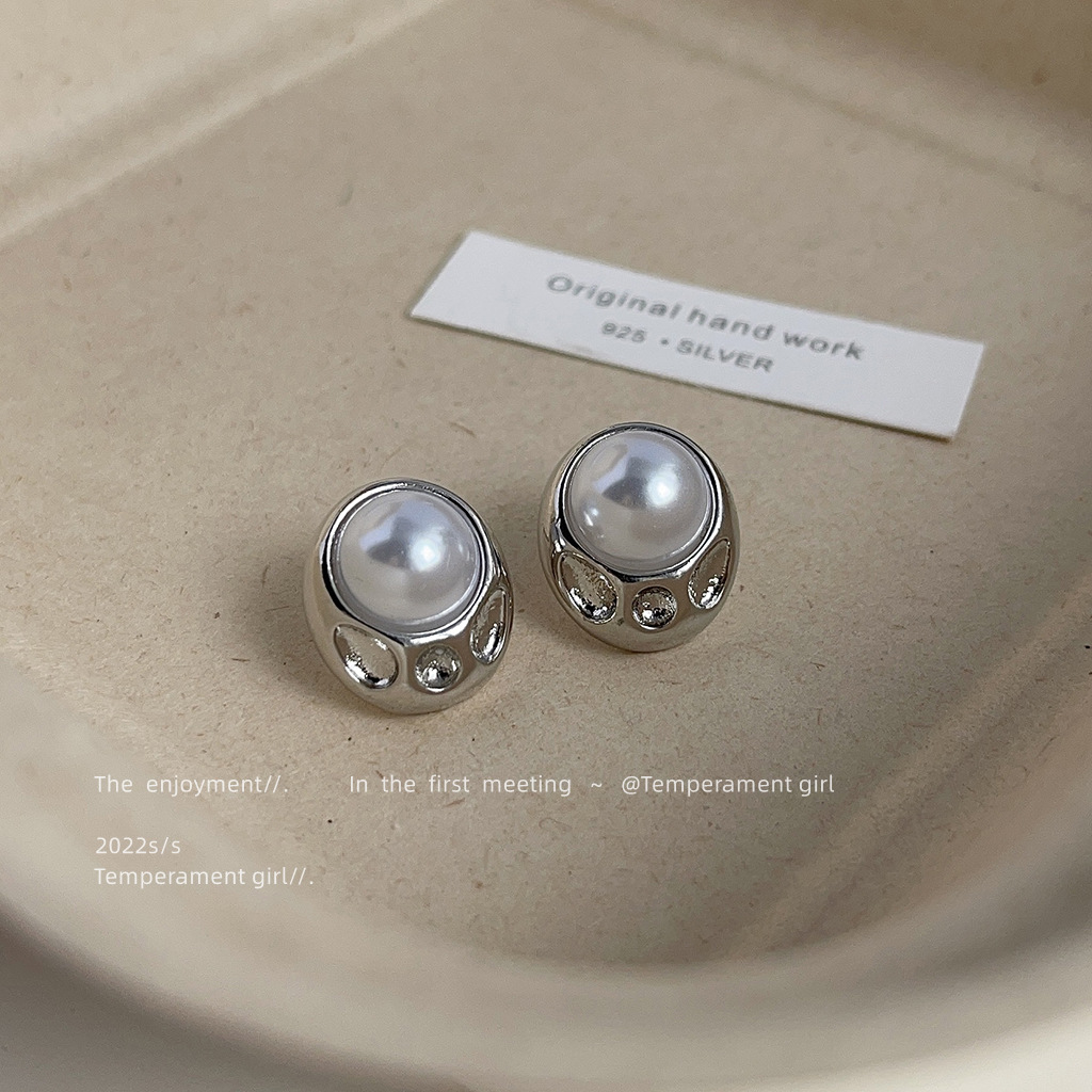 ニッチなデザインの楕円形のメタリックパールイヤリング、女性用の雰囲気のあるハイエンドのシルバーカラーのコールドスタイルの幾何学的なイヤリング