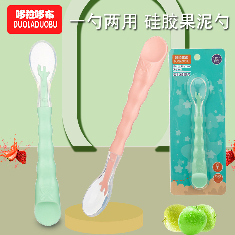 ドラえもん子供二頭の果物と泥のスプーンの赤ちゃんは食事をして補助スプーンの1スプーンの両用のシリコンのスプーンの6399を食べます。