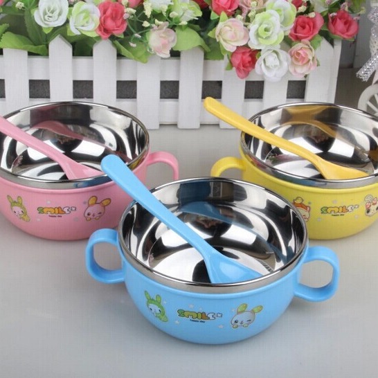 ハンドル付き赤ちゃんステンレスボウル子供両耳漫画断熱ボウルステンレスボウルスプーン8810