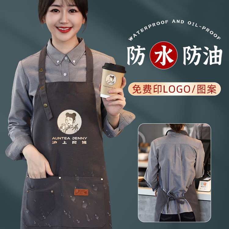 防水キャンバス首掛けエプロンキッチン飲食専用防油ミルクティーカフェロゴ制定印字作業服