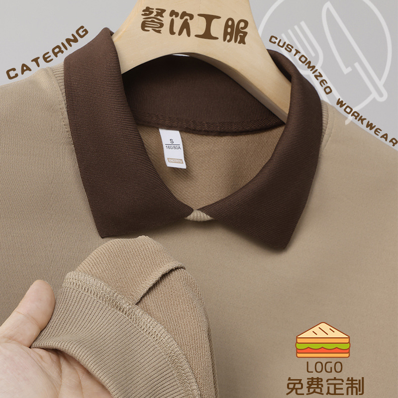 飲食サービス員の作業服が襟をめくってカスタマイズされたガーディアンロゴ秋冬焼肉鍋ミルクティー店のフロント工装