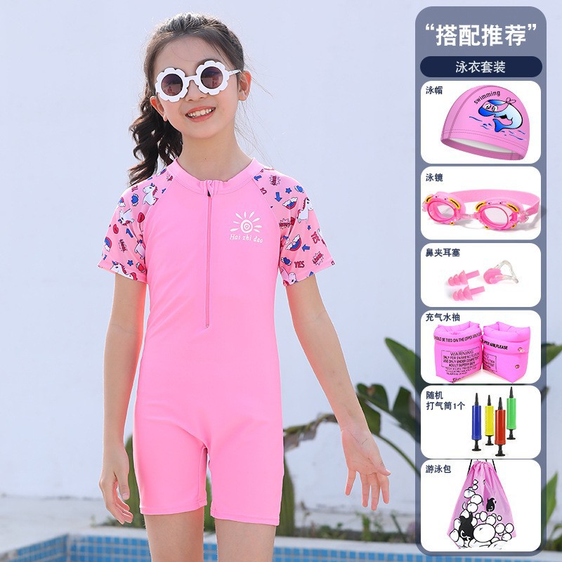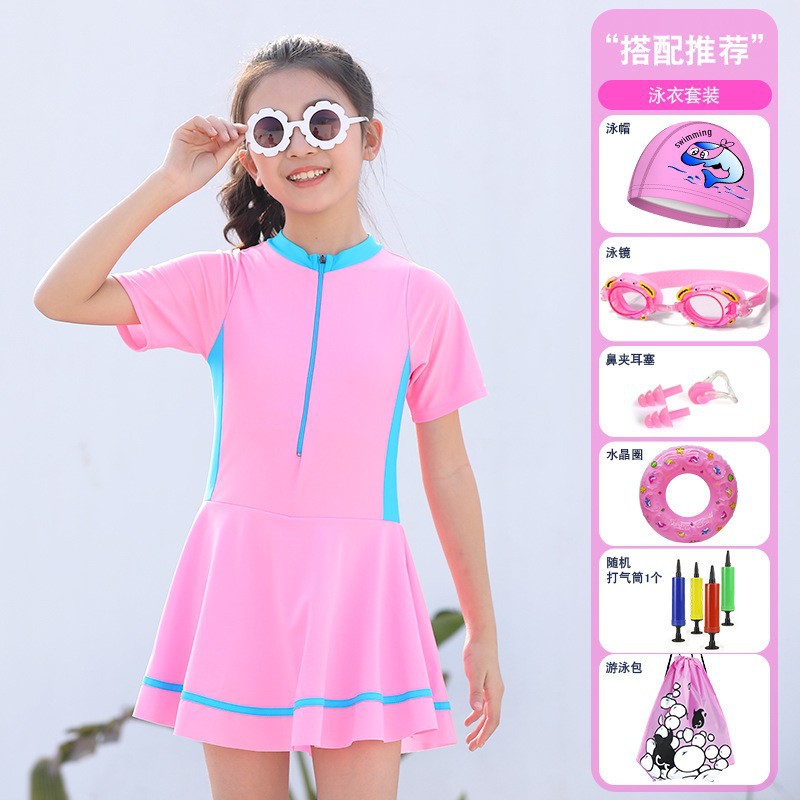 子供の水着の女の子の半袖のワンピースのスカートの日焼け止めの中で大きい子供の女の子は気まずいことを防ぎます。