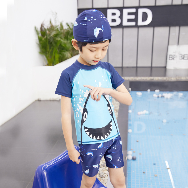 子供の水着の男の子の水着の中で大きい子供の温泉の水泳の帽子の水泳のズボンのスーツは半袖の赤ちゃんの漫画の水着を卸売りします。
