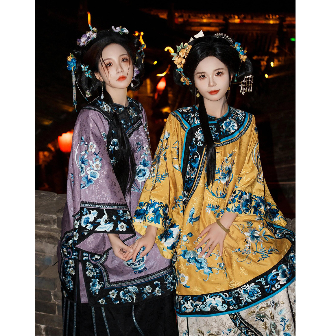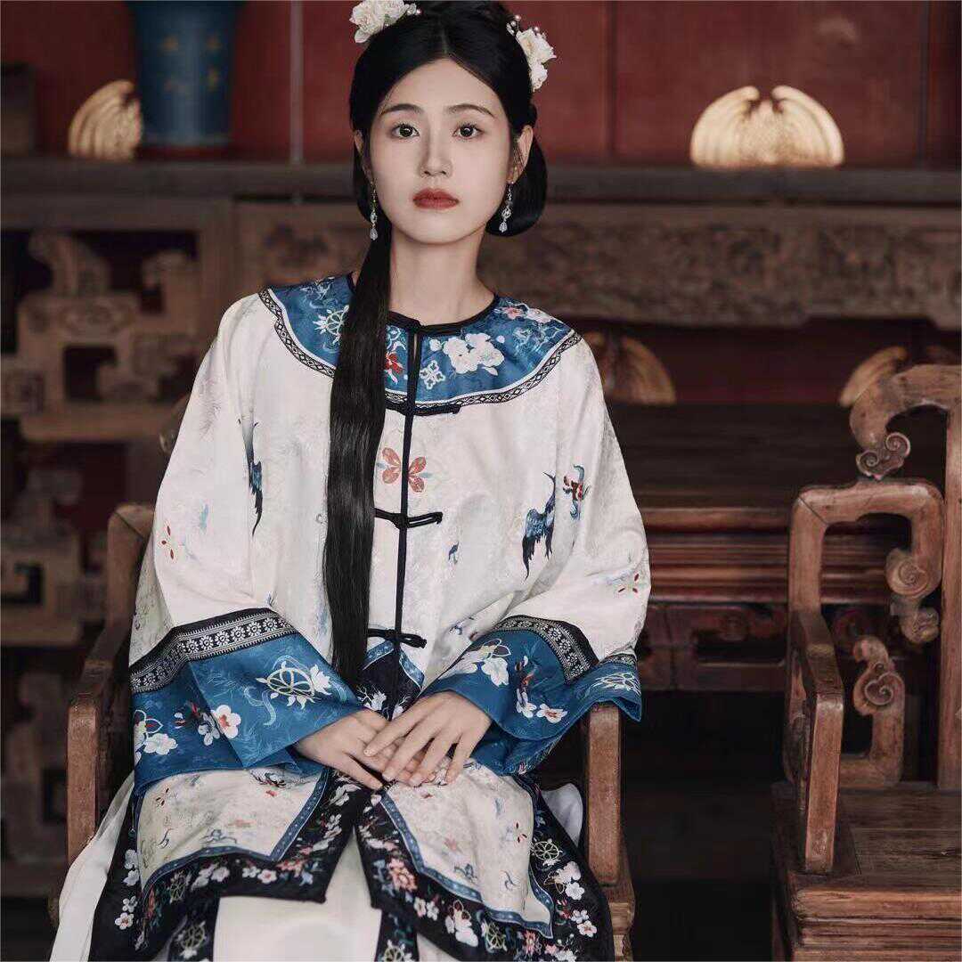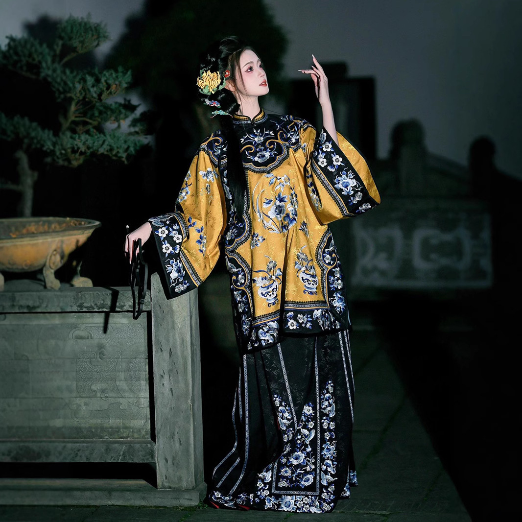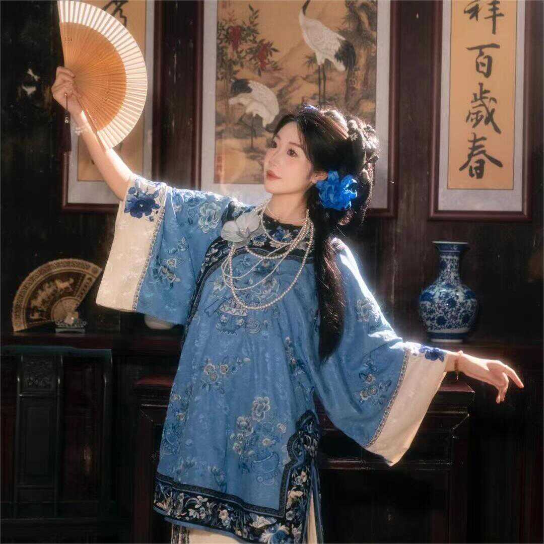 清朝の女性の衣装、丸首、斜めの襟、青と白の磁器、青い漢服、馬面スカートスーツ、晋商の若い女性