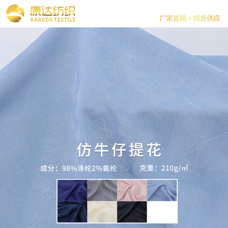 卸売りはデニムの蝶の布帛のジャカードの布の男女の服装の包みのワンピースの子供服のズボンの生地の現物をまねます。