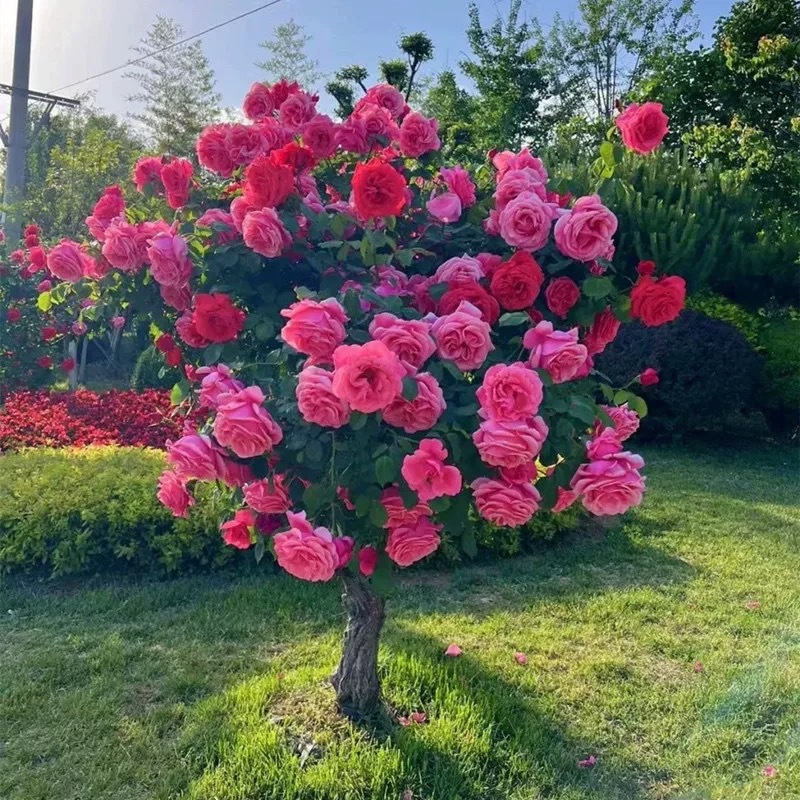 ロリポップローズ、四季咲きの花、鉢植え、中庭、屋外の園芸植物、特大木の切り株、バラの古い切り株