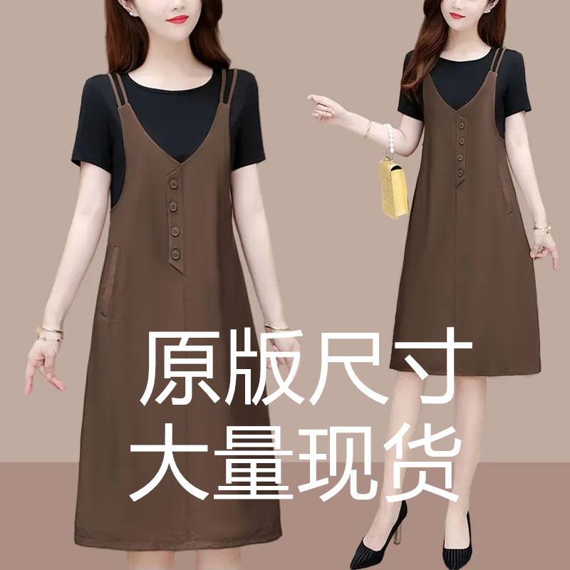 偽ツーピースサスペンダー半袖大きいサイズドレス女性のための 2025 夏の新しいファッションカジュアルお腹カバーマザースカート