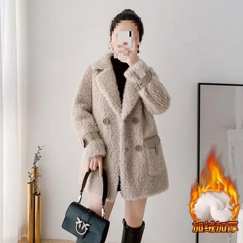 ラムウールシープスキンコート2025秋新作韓国風ファッションミドル丈厚く暖かいラムウールコート