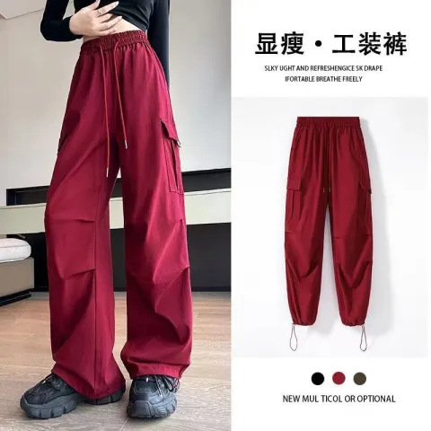 グレーカーゴパンツ女性の夏薄いハイウエストワイドレッグストレートカジュアルデザイン速乾性アメリカンレトロスポーツパンツ