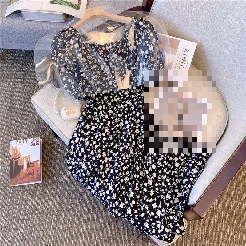 フレンチフローラルドレス2025年夏新作ウエスト痩身スリットパフスリーブシフォンフォレストフローラルロングスカート