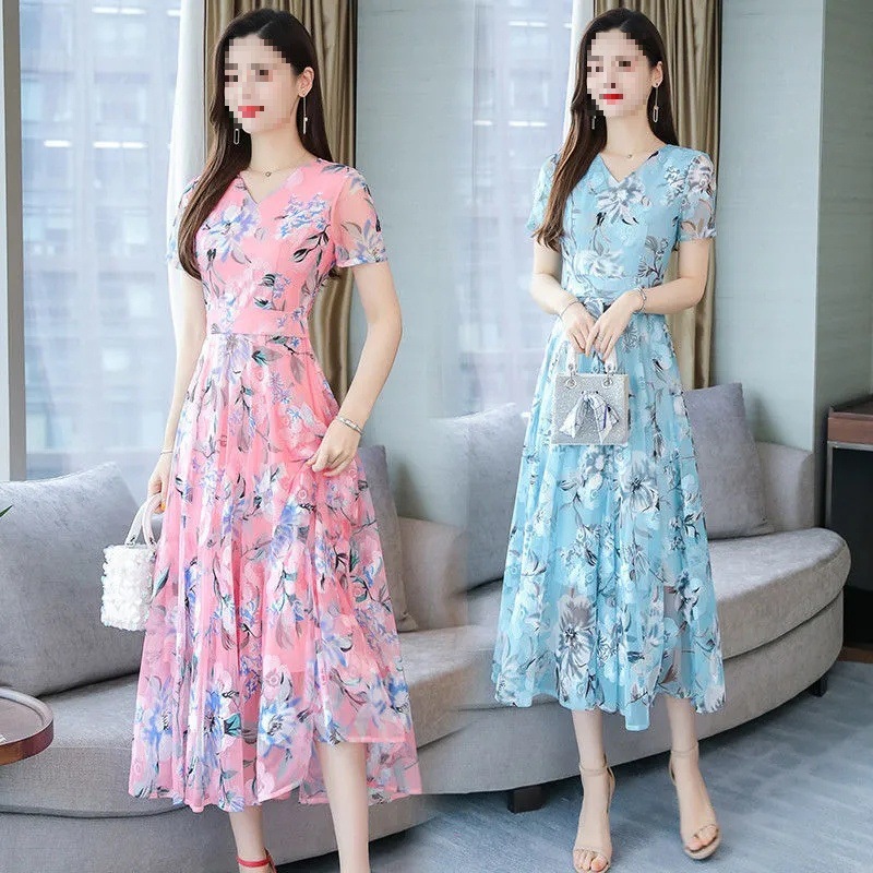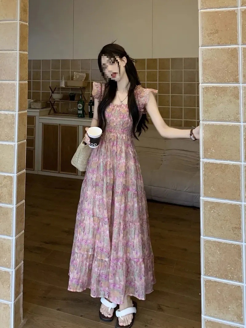 フライングスリーブ花柄ドレスデザイン夏の新しい妖精スカートファッショナブルでシックなスリムフィットロングスカートトレンディ