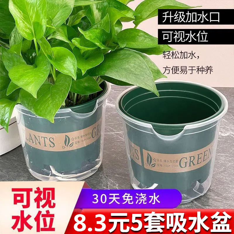怠け者のためのグリーンラタン植木鉢、自動吸水二層プラスチック鉢植え、屋内バルコニー、水やり不要、透明な水貯蔵ガロンポット