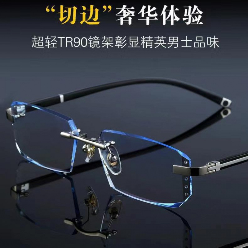 男性用抗青色光放射線メガネ、仕事用コンピュータ目の保護、携帯電話用ダイヤモンドカットフラットミラー、フレームレス近視メガネ