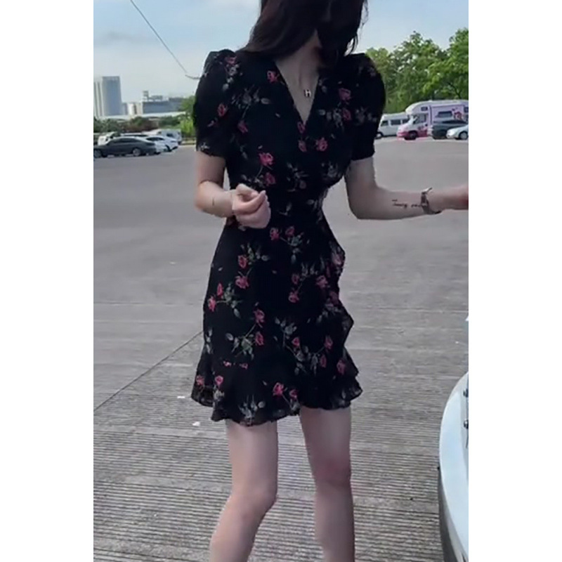2025 夏韓国風西洋スタイル V ネックフリル半袖スカートウエスト痩身プリントショートスカートドレス女性のための